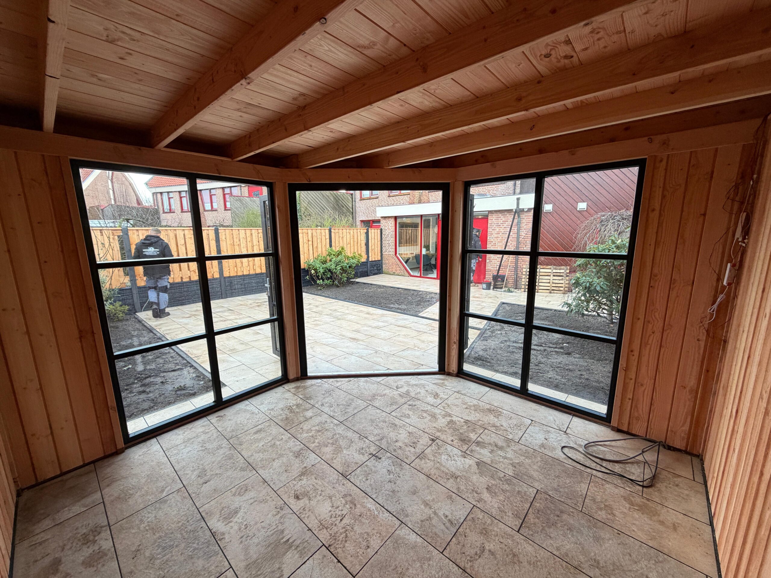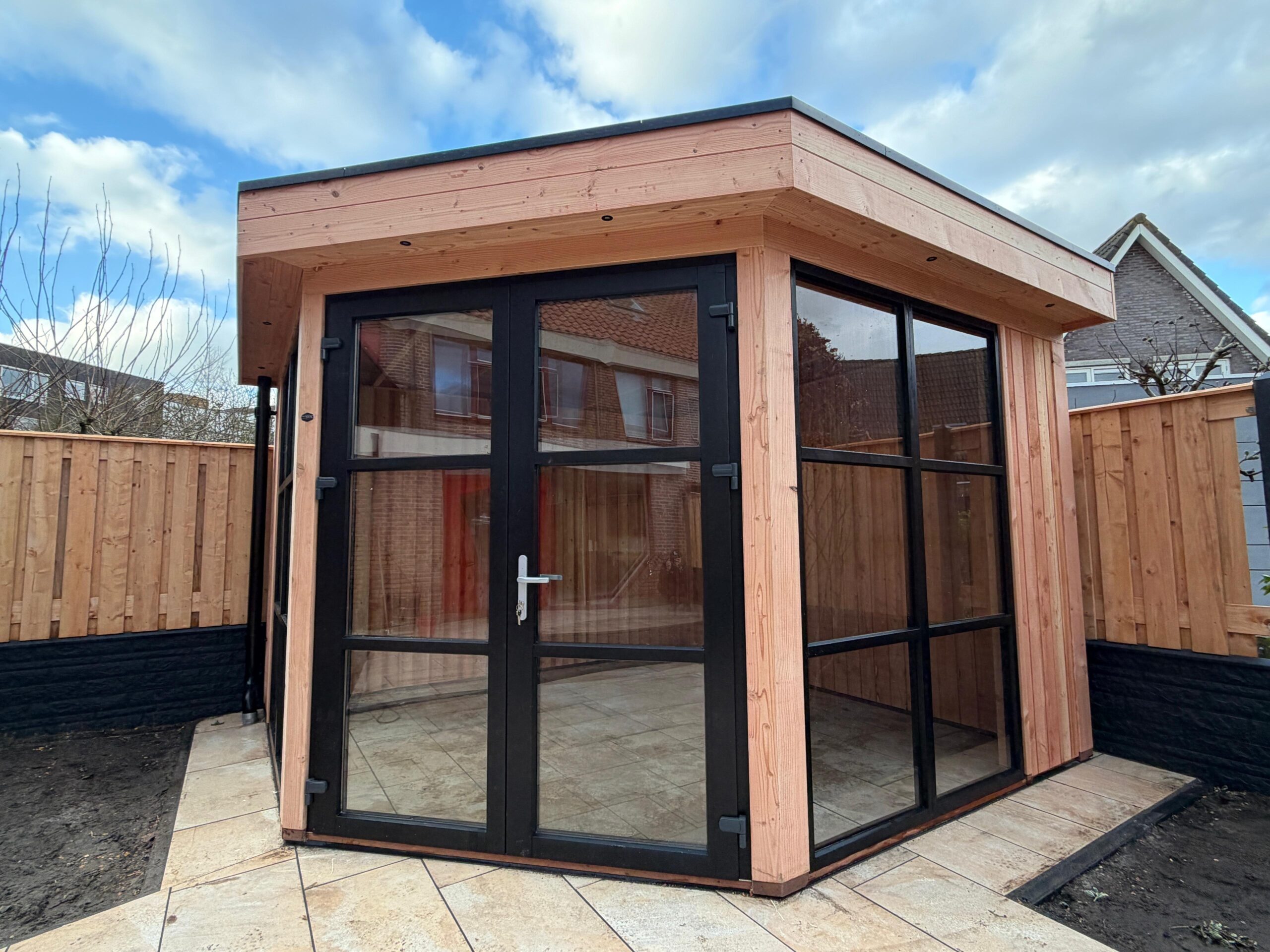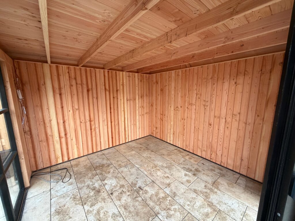 -Buitenzijde voorwanden bekleed met Douglas sponningdelen blank, verticaal aangebracht