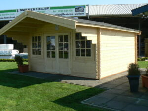 '- Opgegeven maten zijn orenmaten -60mm vuren blokhuthout -500x400cm + luifel 120cm -1 vuren gelamineerde dubbele deur, half glas (kozijnmaat ca. 195x175cm) -2x grote vuren uitzetramen (kozijnmaat ca. 125x100cm) -Isolatieglas -Incl. cilinderslot en luxe klinkstel en stelbare scharnieren -Wandhoogte ca. 216cm, nokhoogte ca. 286cm -Trekstangen in het hout -Winddichte hoekverbindingen -dakshingles (kleur naar keuze: rood, groen, grijs of zwart) -montage pakket + bouwtekening