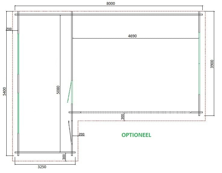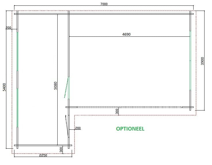 -Berging van 225cm breed + grote veranda van ± 500cm (orenmaten)