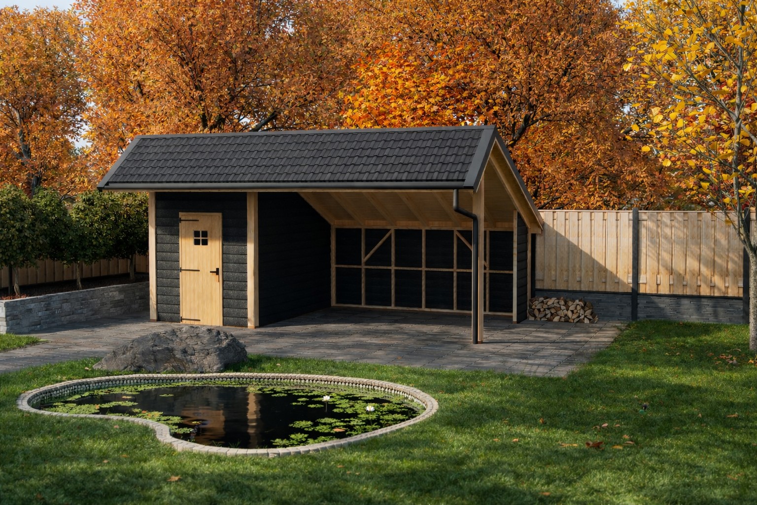 – Hardhouten funderingsrand onder de wanden en aansluitende staanders