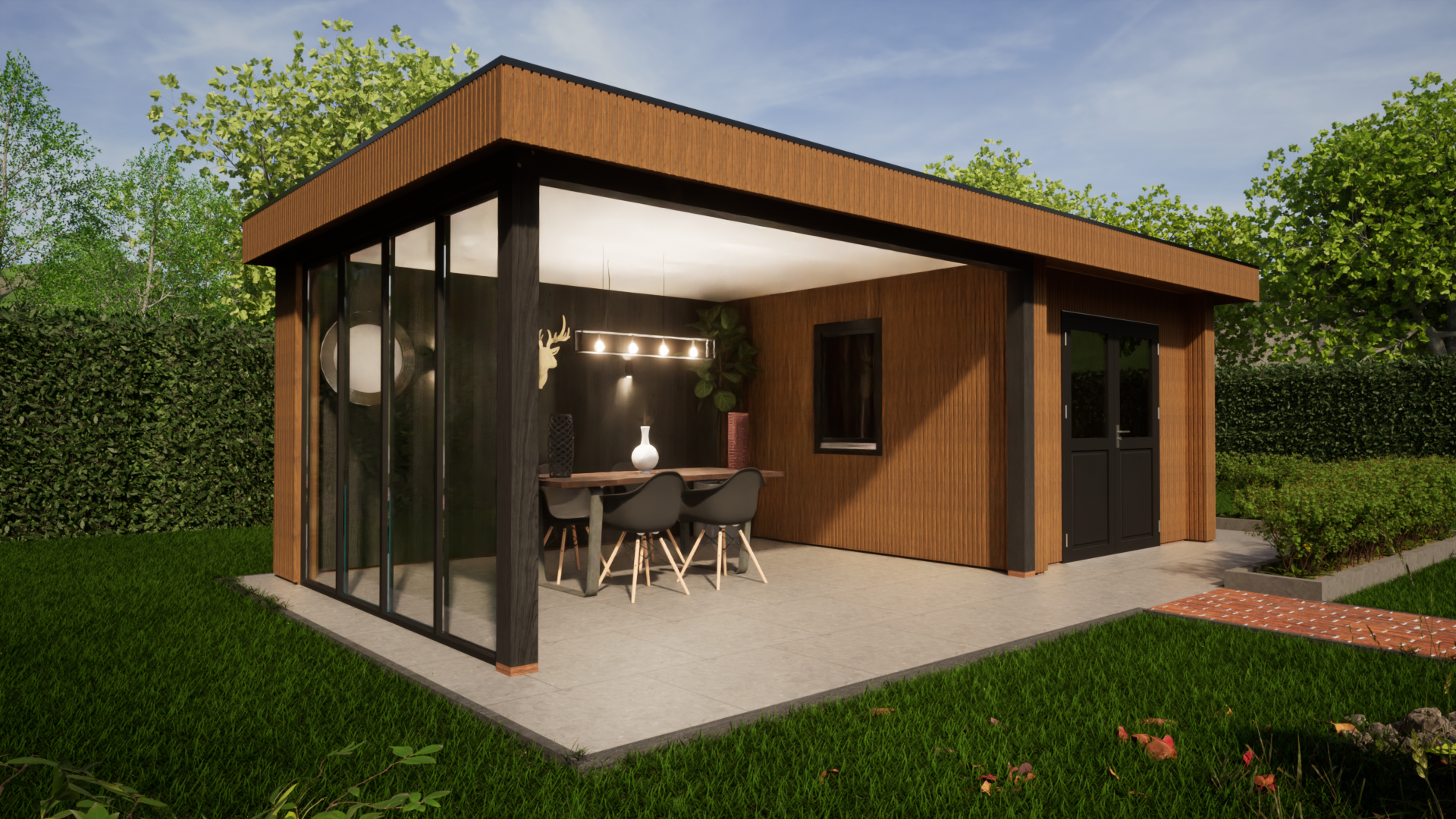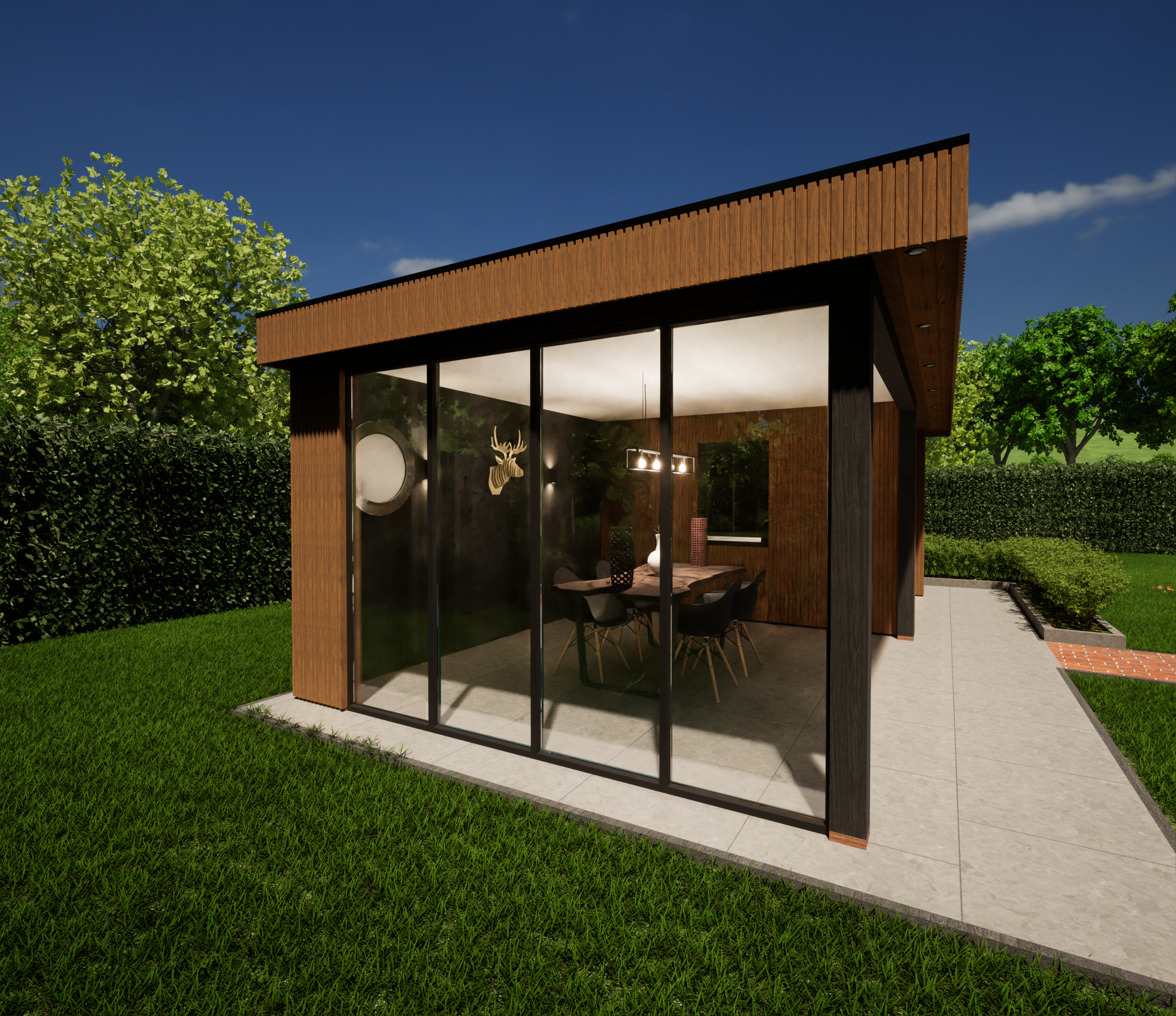 Thermo Ayous is uiterst duurzaam (klasse I-II) en mag onbehandeld buiten worden toegepast (het hout zal dan wel vergrijzen) - 4 stuks ‘’Steellook’’ panelen in zijwand veranda