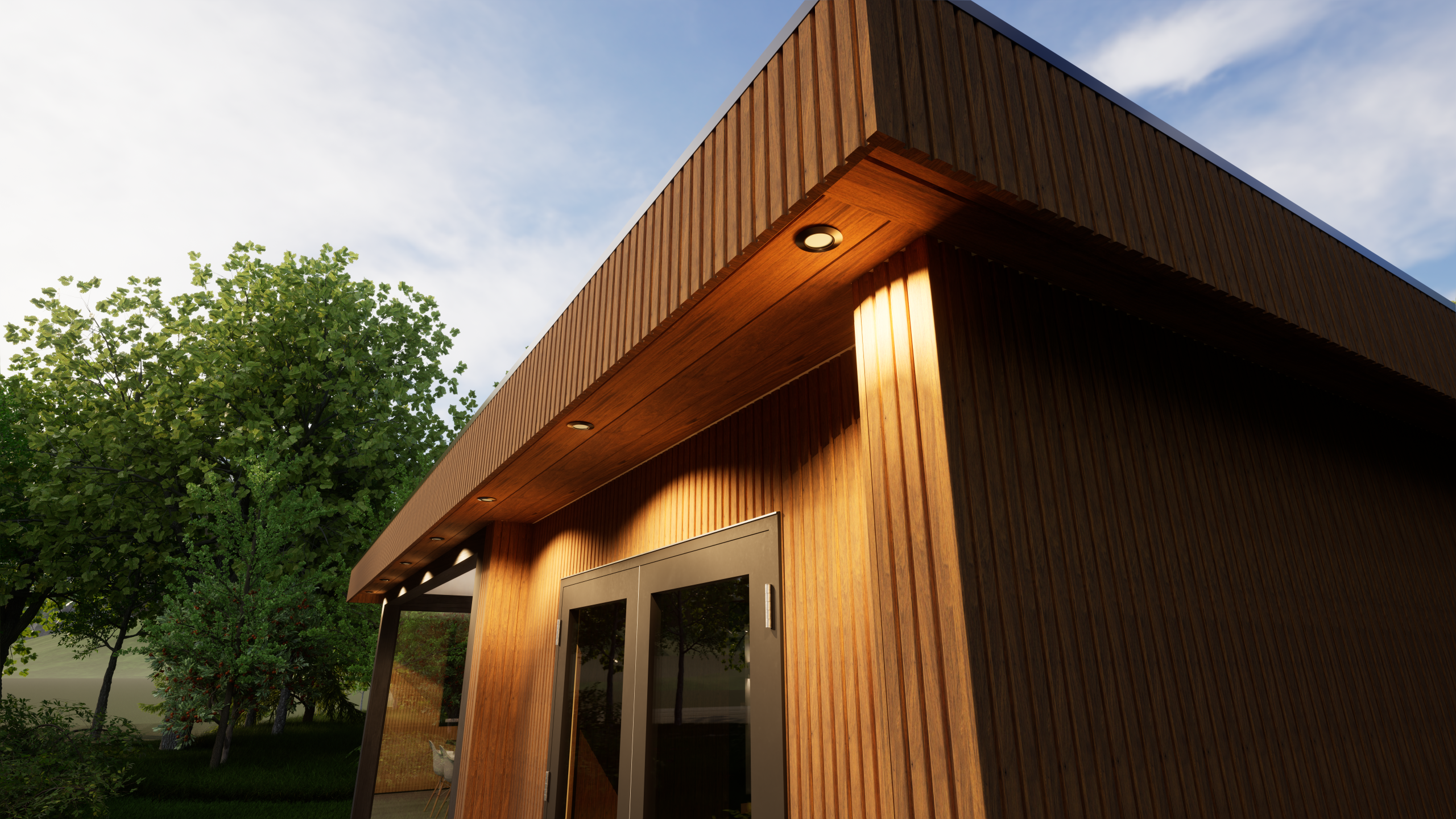 - Wanden bekleed met thermo ‘’Ayous’’ gevelbekleding in Rhombus profiel.