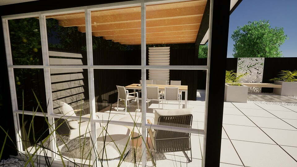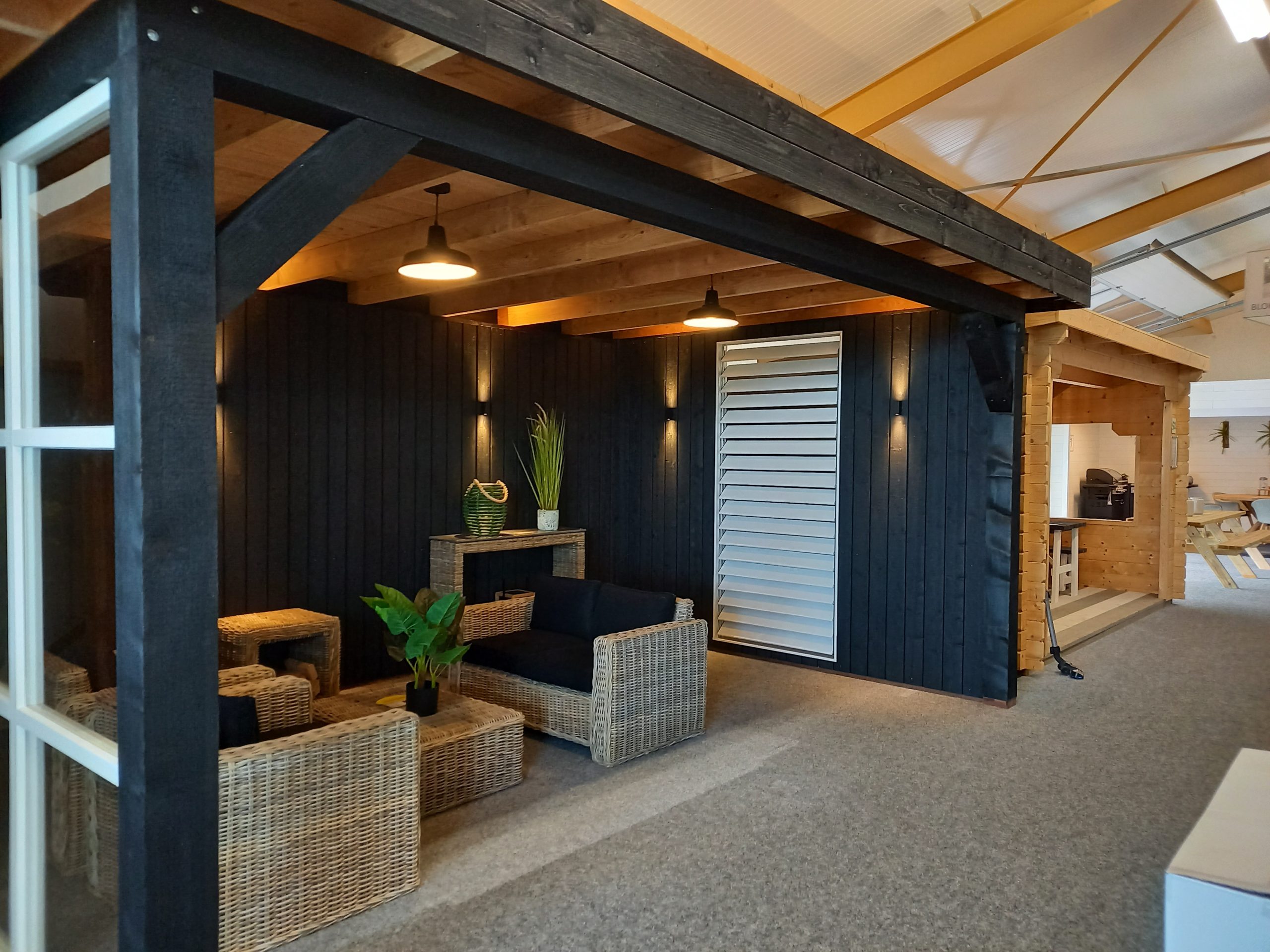 – Buitenzijde achterwand en één zijwand bekleed met verticaal zwart Halfhouts rabat, zwart genageld