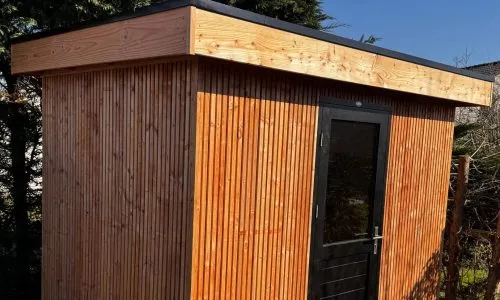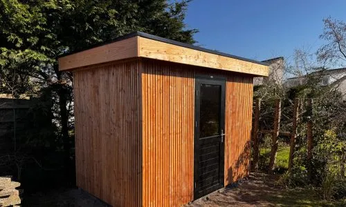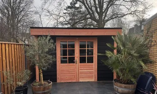 Berging maatwerk -300x200cm buitenkant wand -Wanden enkelzijdig bekleed met Douglas-look rhombus profiel -Hardhouten rand onder de wanden -Enkele zwarte deur, half glas -Dubbel glas -Plat dak -Hoogte…