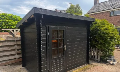 Blokhut Botgat -300x200cm orenmaat -34mm vuren blokhuthout -Gecoat aan de buitenzijde in de kleur Zwart -Vuren enkele deur -Enkel glas 4mm -Lessenaar dak -EPDM dakbedekking