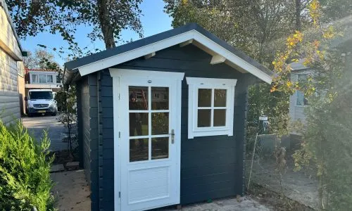 Blokhut “Razende Bol” -250x300cm orenmaat -34mm vuren blokhuthout -Gecoat, 2x aan de buitenzijde: RAL7016 en RAL9010 -Enkele vuren deur half glas -Vuren uitzetraam 4-ruits -Enkel glas 4mm…
