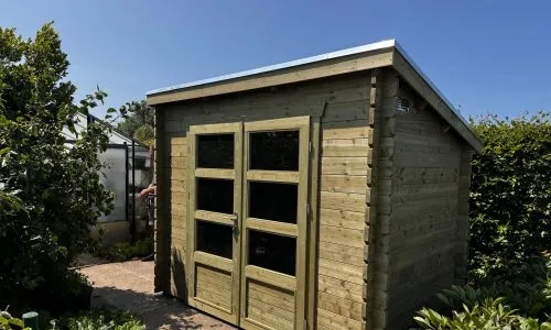 Berging “Kiezel” -300x240cm -Wanden bekleed met geïmpregneerd rabat, RVS genageld -Hardhouten rand onder wanden -Lessenaarsdak -Hoogte voorzijde 225cm, hoogte achterzijde 190cm -EPDM dakbedekking -Hardhouten enkele deur half…