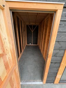 *de rechterzijwand van de berging bekleed met Douglas blank Zweeds rabat