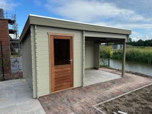 -34mm gecoat blokhuthout , 2 x buitenzijde + binnenzijde veranda