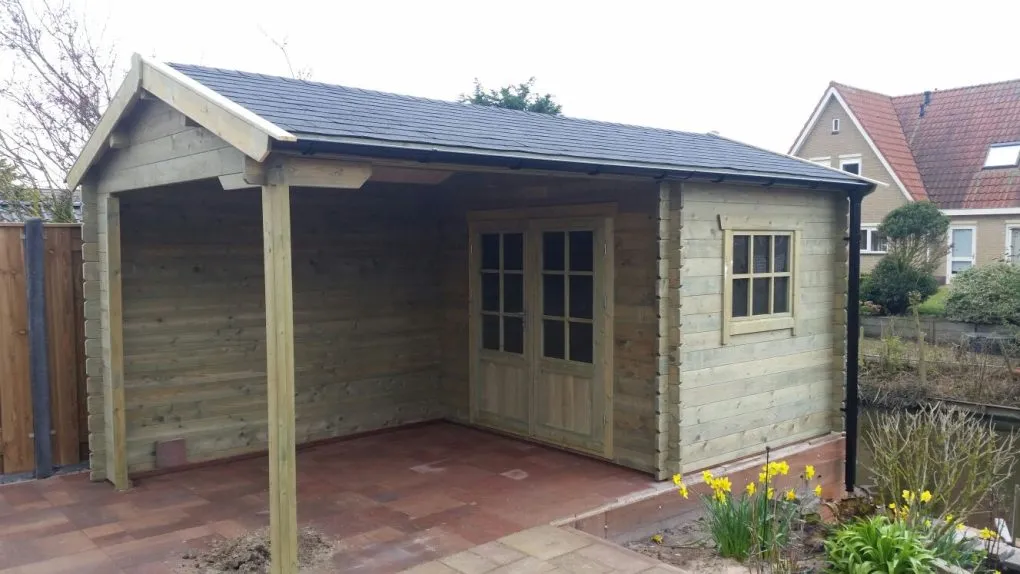 – Waarvan de blokhut 298x250cm orenmaat, rest luifel