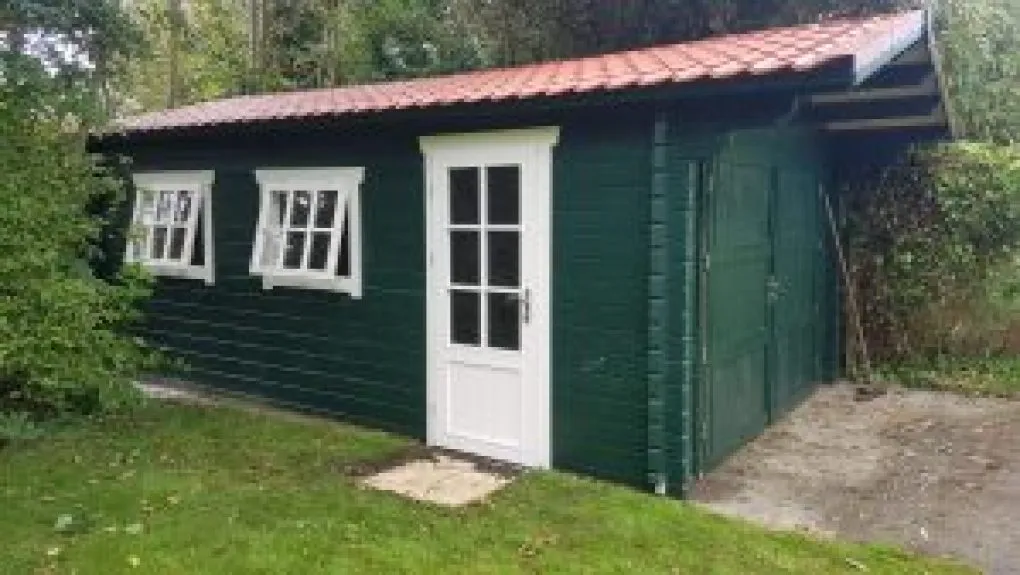 – Buitenzijdes, dubbele deur en waterborden 2x gecoat in RAL 6009 (binnenzijdes + dakhout onbehandeld) 2 uitzetramen en loopdeur RAL 9001