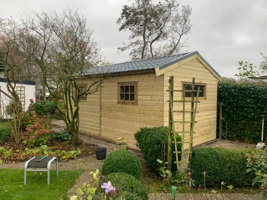 Uitgevoerd in elementbouw, wanden bekleed met geïmpregneerd gevelrabat 18mm (aan 1 zijde bekleed), RVS genageld op solide frame