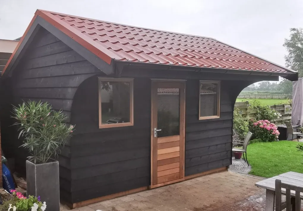 Incl. een hardhouten funderingsrand, hardhouten enkele deur, hardhouten vaste ramen, enkel glas, dakpanprofielplaten rood en een zwart metalen goot