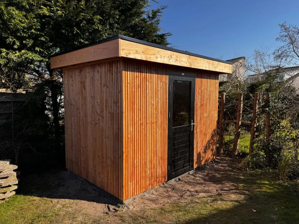 Berging Maatwerk-300x200cm wandmaat-Wanden enkelzijdig met Douglas-look rhombus profiel-Enkele zwarte deur half glas-Dubbel glas-Plat dak-EPDM dakbedekking-Douglas boeideel met zwarte