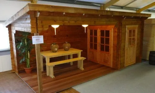 Blokhut + Veranda “Erents” -490x300cm orenmaat, waarvan berging 170cm binnenmaat -34mm bruin geïmpregneerd blokhuthout -Vuren dubbele deur half glas -Enkel glas 4mm -Lessenaarsdak -EPDM dakbedekking -Hardhouten fundering…