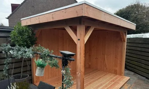 Douglas Overkapping vrijstaand -350x250cm -4 Douglas staanders 140x140mm -Achter- en zijwand gesloten met Douglas blank halfhoutrabat, verticaal aangebracht -Binnenzijde wanden afgewerkt met Douglas blank halfhoutrabat -Plat dak,…
