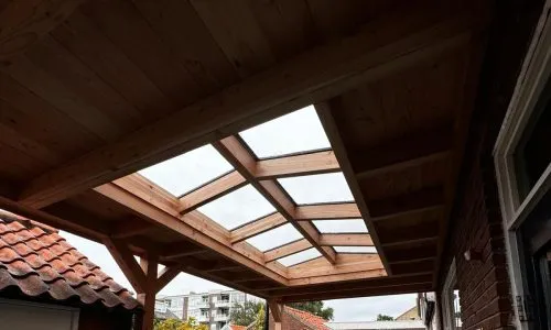 Aanbouw terrasoverkapping “Calciet” -Afmeting 500x390cm -Linkerzijwand gesloten, wand bekleed met Douglas blank Zweeds rabat -Binnenzijde wand bekleed met Douglas Rhombus triple profiel -3 Douglas staanders 140x140mm -2x…