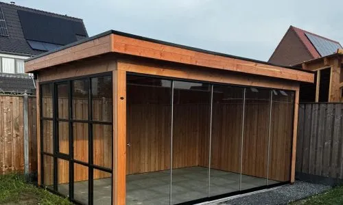 Douglas tuinkamer -509x331cm staandermaat -Buitenzijde van de wanden bekleed met Douglas blank Zweeds rabat -Binnenzijde bekleed met Douglas sponningdelen blank, verticaal aangebracht -5 Douglas staanders 140x140mm -Steellook…