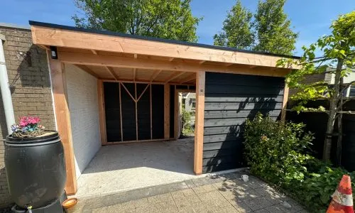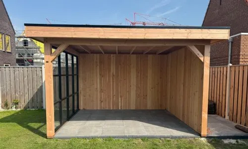 Douglas aanbouw carport -±575x540cm staandermaat -6 Douglas staanders geschaafd 140x140mm, 8 schoren 130x130mm -Rechterzijwand gesloten tot een hoogte van ±180cm, wanden enkelzijdig bekleed (buitenzijde) met Douglas Zweeds…