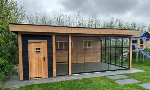 “ Douglas berging maatwerk“ -274,5x200cm ( buitenkant staanders ) -Elementbouw – Wij zetten de wanden af fabriek compleet voor u in elkaar, inclusief bestelde deuren en ramen.…