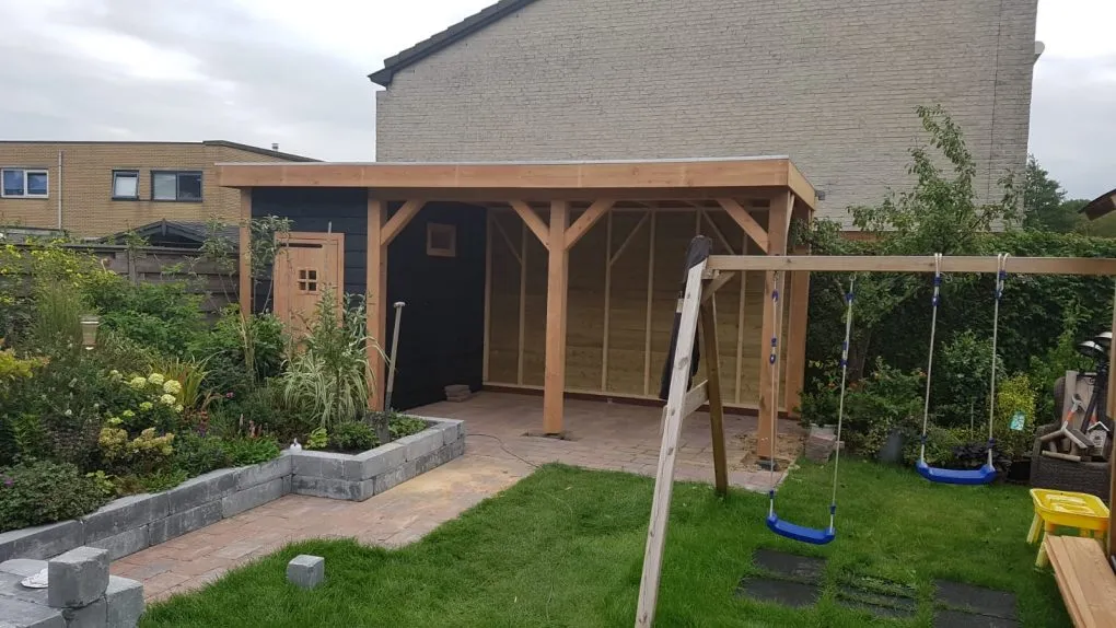 – Achterwand veranda en linkerzijwand berging bekleed met geïmpregneerd gevelrabat 18mm
