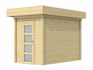 '- Opgegeven maten zijn orenmaten - 34mm Vuren blokhuthout - Lessenaarsdak - Hoogte voorzijde ±250cm (bovenkant boeideel) - Hoogte achterzijde ±205cm - Achterwand en een zijwand gesloten - 1 Zijwand met een grote opening (deze kan ook in de andere wand of geheel gesloten) - Shingles (kleur naar keuze: rood, groen, grijs of zwart) - Montage pakket + tekening